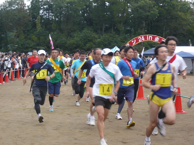 スタートして坂道を下ると、したの方にグーの姿が見える。色気を出して追って見る。なんとか一周したところで追いつきそうになるが、Bチームは内山さんに交代し元気よく走りだす。ウチのテント前に来ると私がすぐ後ろにいると声がかかった内山さんが振り向きホントだって顔をして逃げる。なんとか下り坂で抜くが相手は一周目、かなり粘ってついてくる気配を感じながらノリへタスキを渡す。timeは18分49秒、4分25秒/kmってところ。一周目結構追って二周目は逃げたんで、この1回目で結構くたばってしまった。