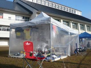 今年の外部テントは軽くてコンパクト。あっと云う間に組立完了、続いて内部も手馴れたもので多少の配置手直しやコンクリートに酒を飲ませるというハプニングがあったものの問題なく設置完了。
